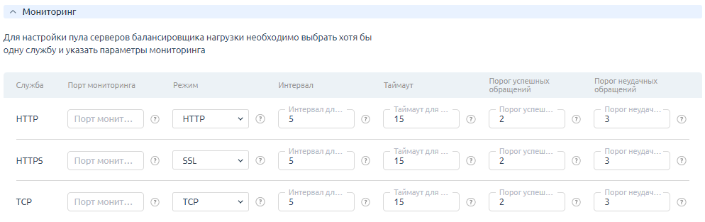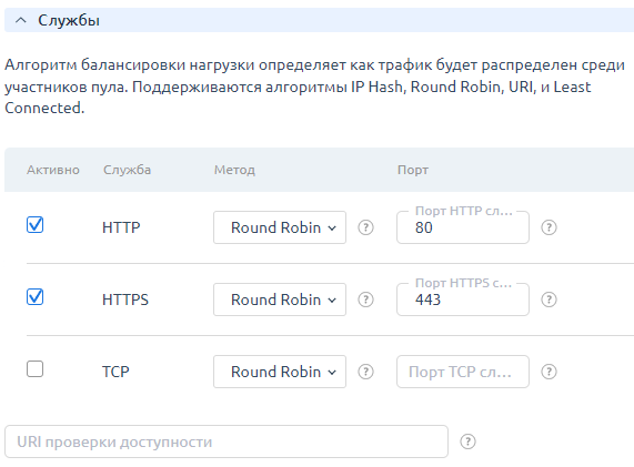 - URI проверки доступности — адрес для проверки состояния сервера, используется протокол HTTP.