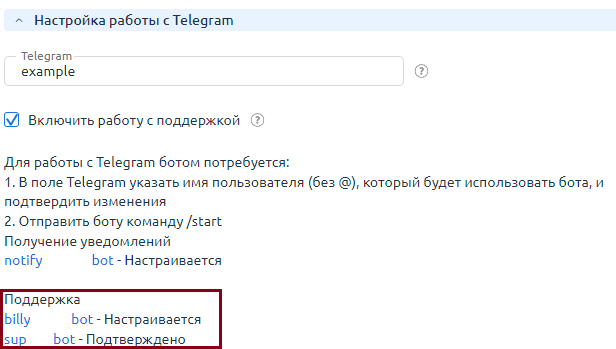 Чтобы включить работу с поддержкой через мессенджер и узнать имя бота провайдера: