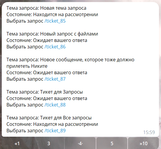 - Нажмите на интересующий запрос, чтобы бот отобразил информацию о последнем тикете: