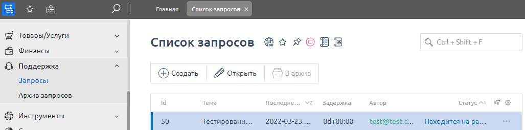В разделе Поддержка → Список запросов вы можете:
