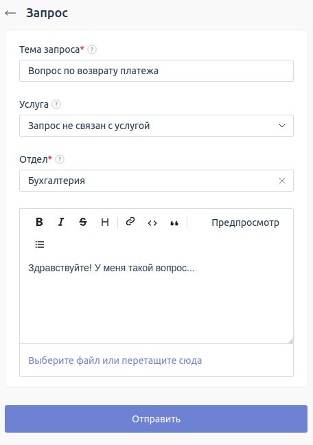 - Выберите отдел, в который хотите направить свой вопрос. Например, "Техническая поддержка". Задайте ваш вопрос или опишите проблему. Вы также можете выбрать услугу, к которой относится вопрос, и прикрепить файл к сообщению.