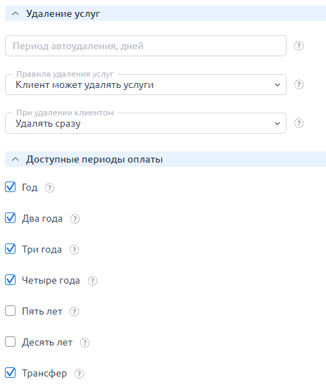 - Доступные периоды оплаты — периоды заказа, которые будут доступны при настройке тарифного плана. Если предполагается предоставление услуги трансфера доменных имен, то период с типом "Трансфер" должен быть включен.
