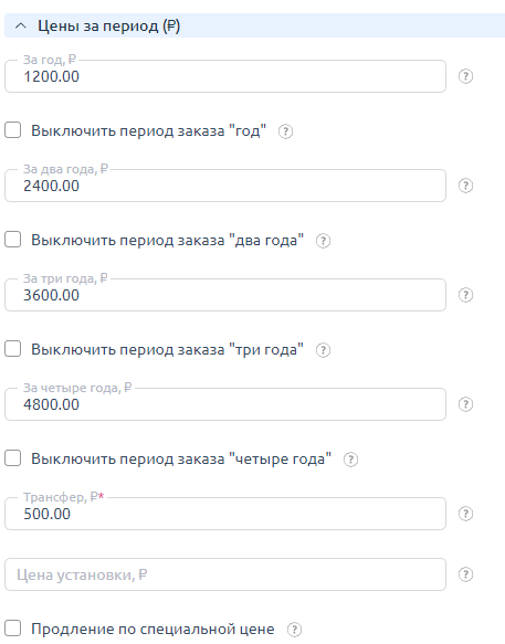 Если выбрана одна из опций, разрешающая трансфер домена, то на вкладке Цены за период появляется возможность указать его стоимость:
