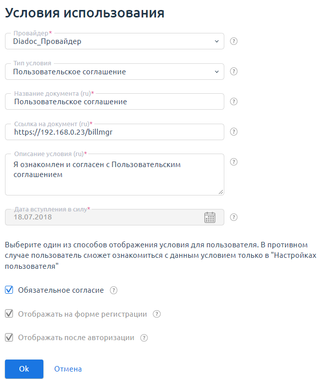 - Пользовательское соглашение — согласие клиента с условием такого типа означает, что он принимает условия пользовательского соглашения провайдера;