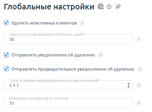 В соответствии со статьёй 5 GDPR провайдер не должен хранить данные о клиенте дольше, чем требуется для достижения цели сбора информации. В Clouden имеется функция, которая позволяет автоматически удалять неактивных пользователей. Для её активации перейдите в глобальные настройки провайдера: Провайдер → Глобальные настройки → блок Основное → флаг Удалять неактивных клиентов.
