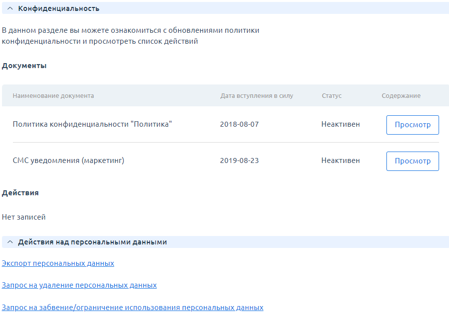 Клиент может ознакомиться с документами о сборе и обработке персональных данных, с журналом согласий и отказов, а также запросить информацию об используемых персональных данных в разделе Клиент → Настройки пользователя → блок Конфиденциальность. В этом же блоке клиент может создать запрос на удаление и ограничение использования персональных данных.
