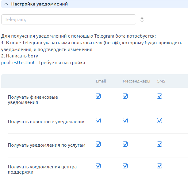 В блоке Настройка уведомлений клиент может управлять активными подписками на СМС или email рассылки: