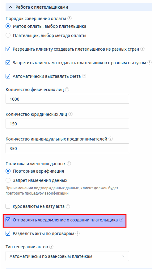 После активации этой опции поле Email на форме создания плательщика станет обязательным для заполнения. При добавлении выполняется сравнение информации о плательщике и об учётной записи, от имени которой создаётся плательщик. Если данные отличаются, то на email плательщика высылается сообщение о том, что его персональные данные были использованы для создания плательщика.