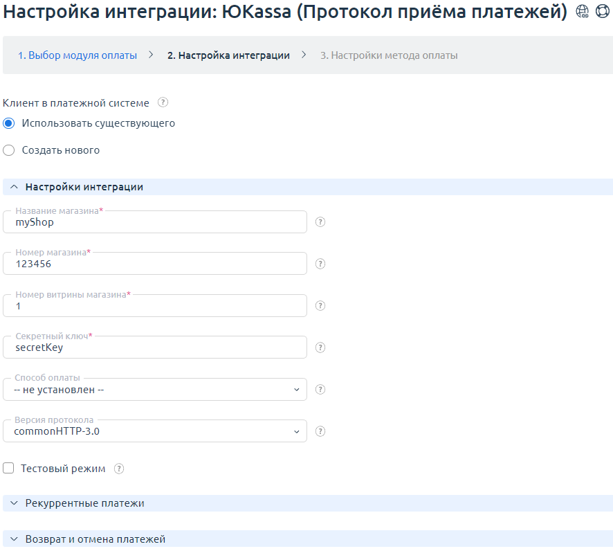 Заполните форму, используя данные существующего клиента в платёжной системе:- Название магазина — название магазина или сервиса.