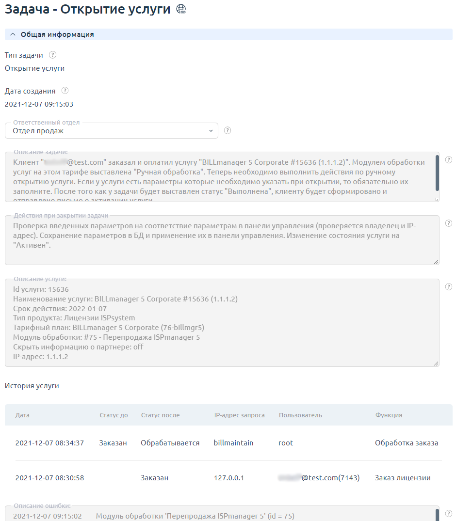 Рассмотрим еще один пример: провайдер предоставляет услуги DNS-хостинга и обрабатывает их в автоматическом режиме. Это значит, что для открытия услуги достаточно только запроса от клиента. Биллинговая система подключается к необходимой сторонней панели управления и открывает услугу автоматически. Иногда могут возникать ошибки автоматической обработки, в таком случае создается задача, которую требуется обработать в ручном режиме.