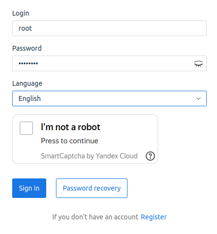 - настроить защиту форм регистрации и авторизации, выбрав из нескольких вариантов задания для CAPTCHA различной сложности. Например, распознавание текста, слайдер, или калейдоскоп. Подробнее о настройке Yandex SmartCaptcha на стороне Яндекс см. в официальной документации Yandex.