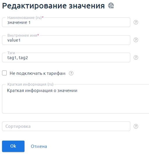 С помощью кнопок Вкл. и Выкл. в разделе Продукты → Типы продуктов → Параметры → Значения регулируется подключение значения ко всем подходящим тарифам.