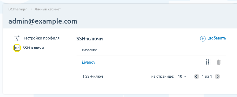 SSH-ключ состоит из открытой и закрытой части. Открытые части ключей вы можете сохранить в личном кабинете. При установке операционной системы вы можете выбрать один из сохранённых ключей. DCImanager 6 скопирует ключ на сервер и будет использовать этот ключ для аутентификации доступа.