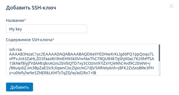 Укажите произвольное Название и открытую часть Содержимого SSH-ключа.