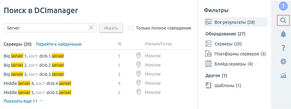 Глобальный поиск позволяет найти различные объекты платформы. Например, оборудование, стойки, локации, склады, шаблоны ОС, пулы IP-адресов, пользователей и т.д. Чтобы воспользоваться поиском, в правом меню нажмите значок