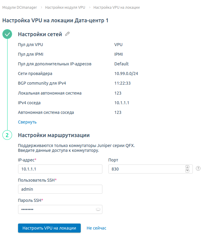 При успешной настройке сервис bird запустит синхронизацию маршрутов на сетевом оборудовании. После синхронизации маршрутов в платформе появится возможность создавать VPU-сети.