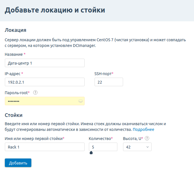 При первом входе в DCImanager 6 открывается форма начальной настройки. Она предназначена для создания первой локации и стоек в ней. Подробнее о локациях см. в статье Локации. Общая информация.