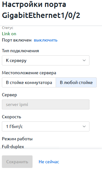 При выборе значений "Авто" и "Авто 10/100 Мбит" скорость порта устанавливается автоматически. Значение скорости будет зависеть от возможностей сервера, коммутатора и соединительного кабеля.