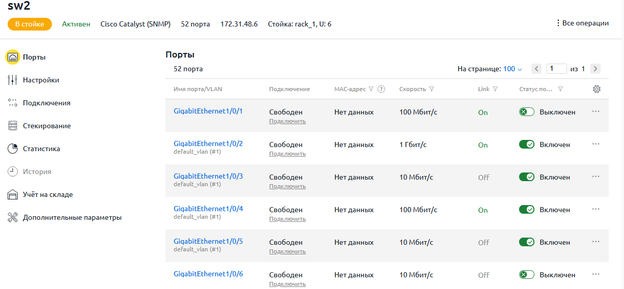 Для работы с портами коммутатора перейдите в Оборудование → Коммутаторы → нажмите на название коммутатора → Порты.