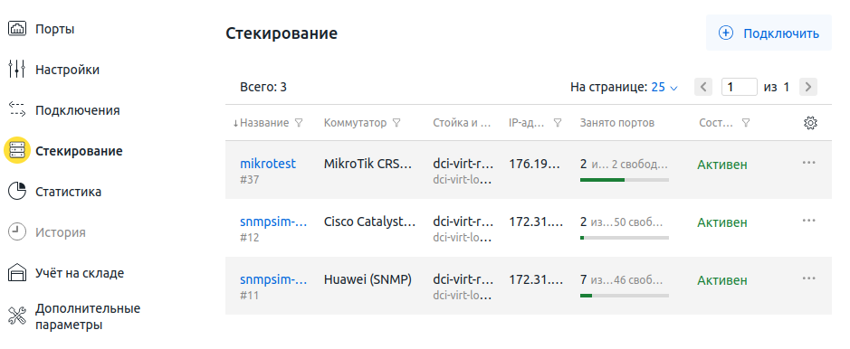 - Перейдите в Оборудование → Коммутаторы → нажмите на название коммутатора → Настройки → Стекирование.