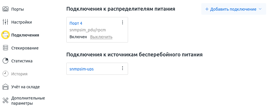 Чтобы просмотреть или настроить источники питания коммутатора, перейдите в Оборудование → Коммутаторы → нажмите на название коммутатора → Настройки → Подключения. Вы можете управлять двумя типами источников питания: ИБП и PDU.