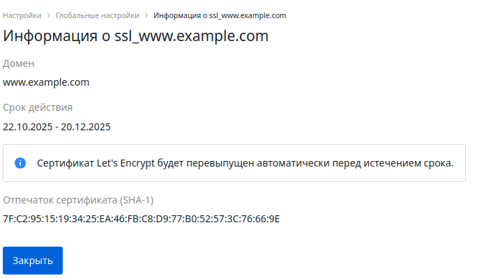 Чтобы просмотреть информацию о подключённом сертификате, нажмите на ссылку в строке SSL-сертификат.