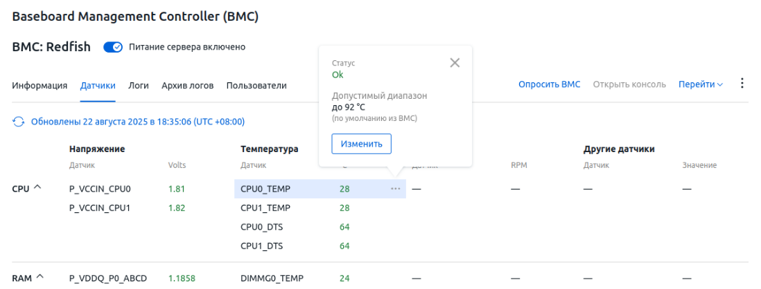 В настройках BMC для датчиков указывается допустимый диапазон значений. Если показания датчика находятся в пределах диапазона, они отображаются на вкладке зелёным цветом, если выходят за границы диапазона — красным.