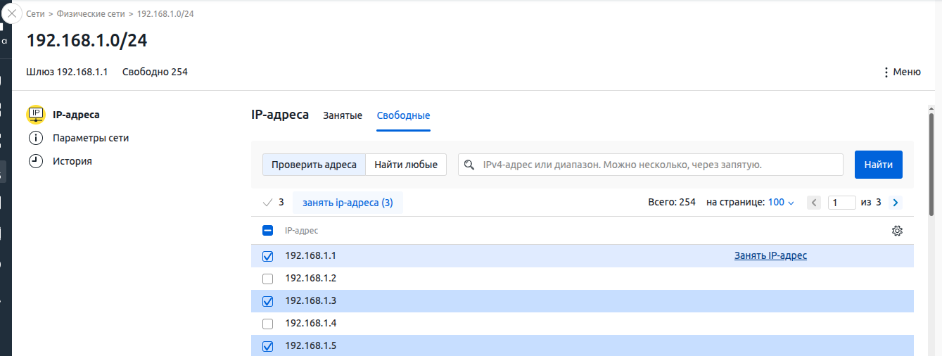 Чтобы просмотреть свободные адреса в IPv4-сети, перейдите в Сети → выберите сеть → вкладка IP-адреса → вкладка Свободные.