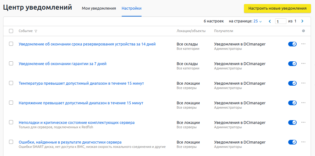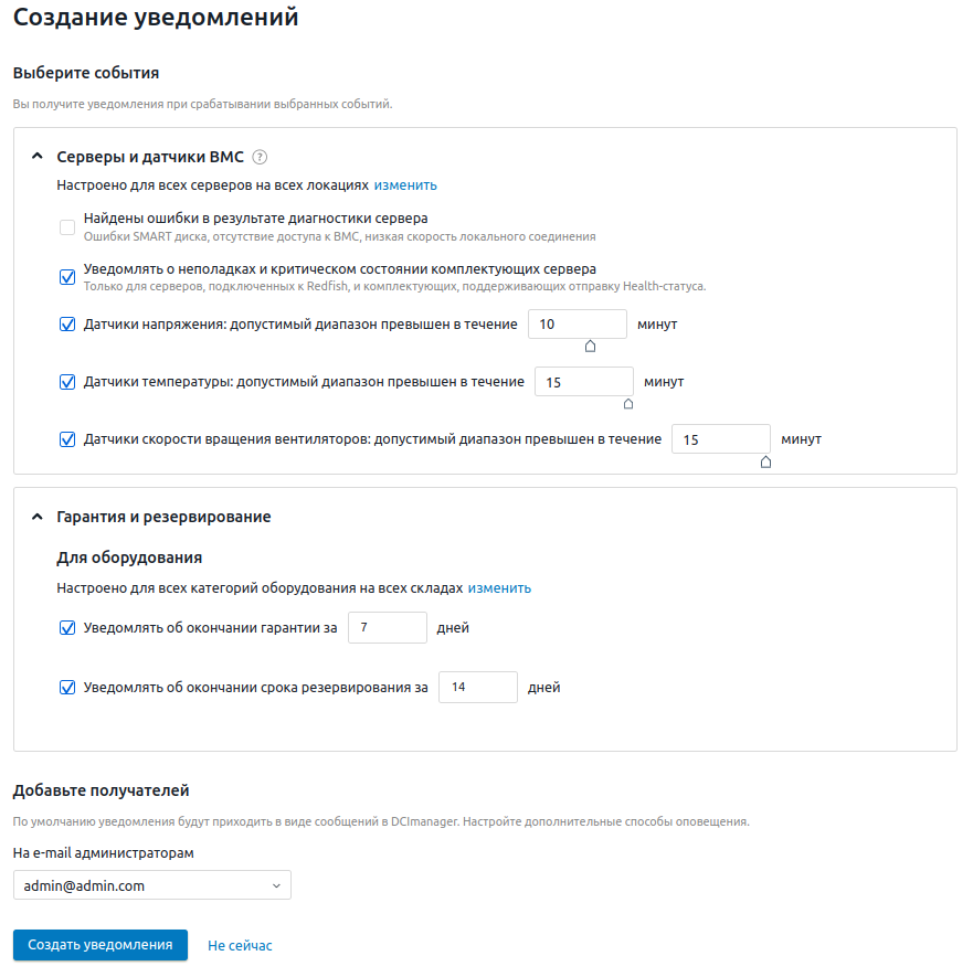 В DCImanager 6 можно настроить следующие виды уведомлений:
