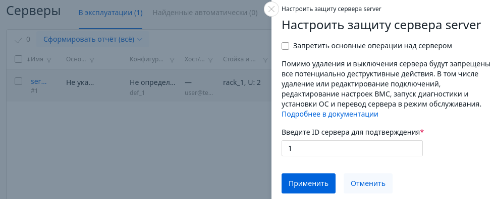 Чтобы включить защиту сервера, в левом меню перейдите в Серверы → выберите нужный сервер → напротив него нажмите → Настроить защиту сервера → отметьте опцию Запретить основные операции над сервером → Применить.