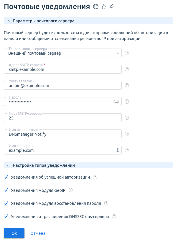 Укажите Имя отправителя и доменное Имя Сервера, которые будут указаны в уведомлениях.