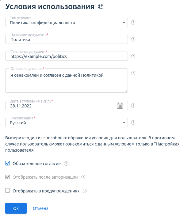 - Обязательное согласие — опция принятия условия на форме после авторизации. Без согласия с таким условием невозможно продолжить работу в панели управления;