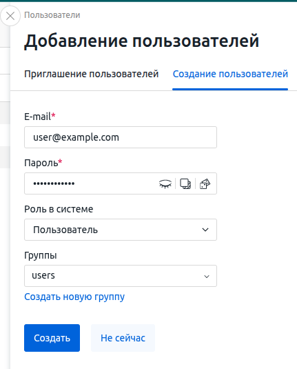 приглашение пользователя — пользователь получит приглашение на email. Для регистрации пользователю нужно будет перейти по ссылке из письма и придумать пароль;