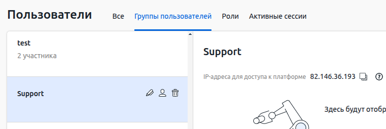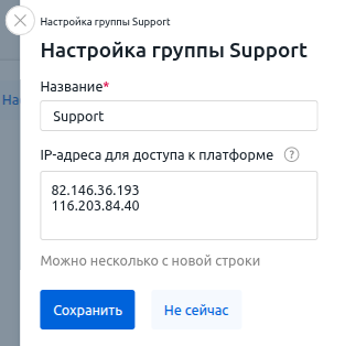 Если авторизация в платформе доступна только с определённых IP-адресов и для техподдержки ISPsystem создан отдельный пользователь, убедитесь, что ему разрешён доступ с IP-адресов 82.146.36.193 и 116.203.84.40. Для этого: