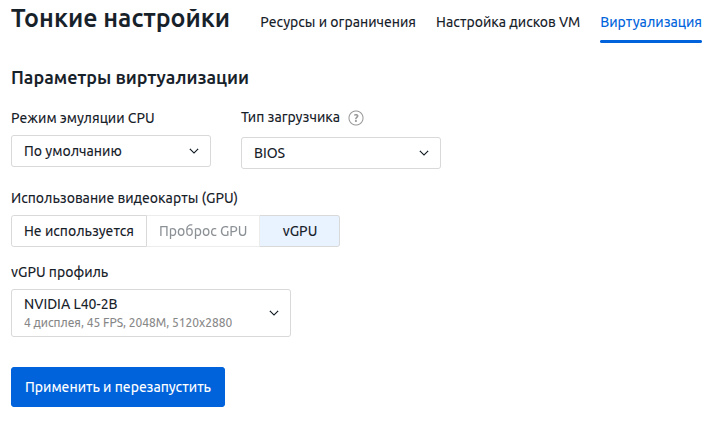 Чтобы ВМ могли использовать vGPU, при создании конфигурации в разделе Параметры виртуализации: