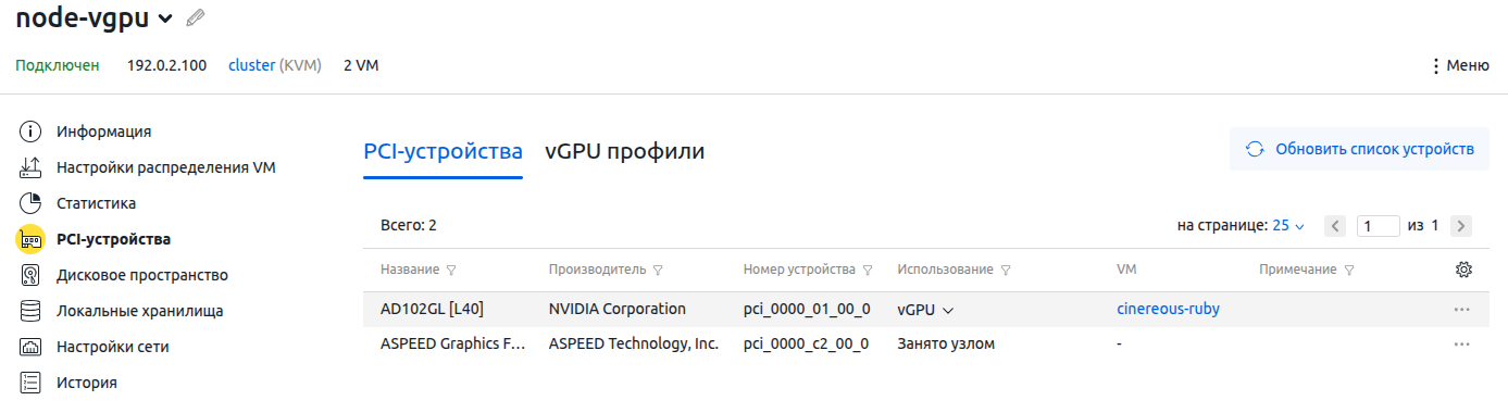 Если на узле кластера установлено несколько GPU-устройств, часть из них может использоваться для проброса GPU, а остальные — для создания ВМ с поддержкой vGPU.