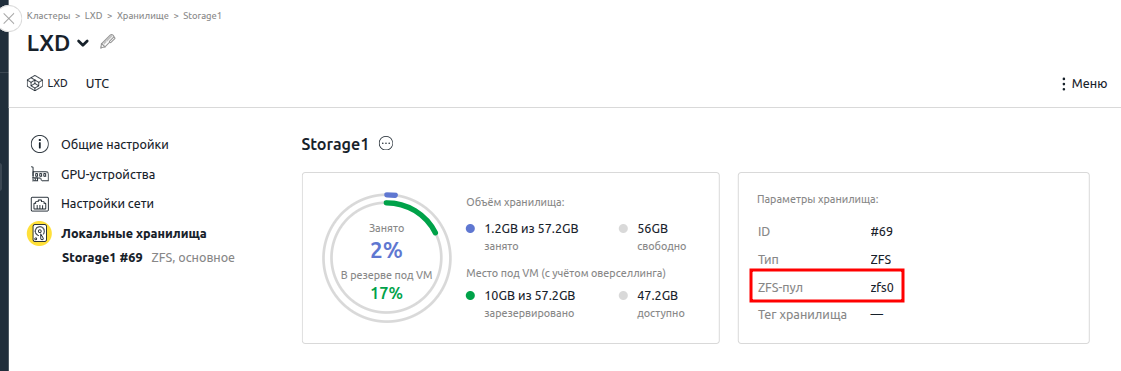 NAME MAJ:MIN RM SIZE RO TYPE MOUNTPOINT loop0 7:0 0 91.9M 1 loop /snap/lxd/32662 loop1 7:1 0 40.9M 1 loop /snap/snapd/20290 loop2 7:2 0 49.3M 1 loop /snap/snapd/24792 loop3 7:3 0 63.3M 1 loop /snap/core20/1828 loop5 7:5 0 73.9M 1 loop /snap/core22/2045 loop6 7:6 0 114.4M 1 loop /snap/lxd/33110 sr0 11:0 1 1024M 0 rom vda 252:0 0 50G 0 disk ├─vda1 252:1 0 1M 0 part └─vda2 252:2 0 50G 0 part / vdb 252:16 0 50G 0 diskCODE - Определите имя пула. Для этого в интерфейсе платформы перейдите в Кластеры → выберите кластер → кнопка Параметры → раздел Локальные хранилища → параметр ZFS-пул.