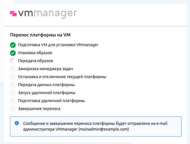 - Нажмите кнопку Перенести платформу на VM → Начать перенос платформы. Откроется страница с отображением статуса переноса.