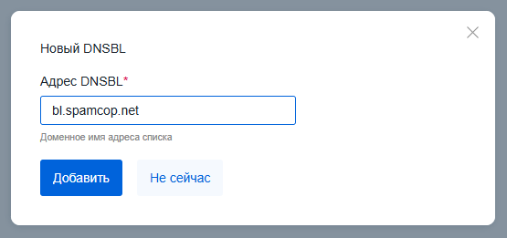 Чтобы добавить список, нажмите Добавить DNSBL и укажите доменное имя списка. Рекомендуем использовать список bl.spamcop.net.