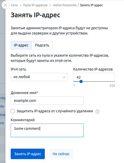 → IP-адреса и диапазоны. - Нажмите кнопку Занять IP-адрес.