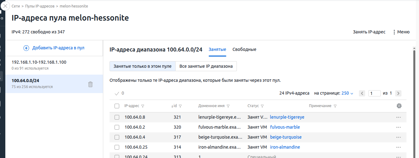 Чтобы управлять адресным пространством пула, перейдите в раздел Сети → вкладка Пулы IP-адресов → выберите пул → меню