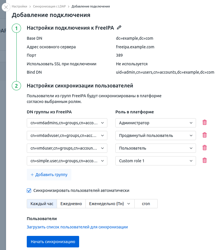 - Нажмите кнопку Начать синхронизацию. Платформа запустит процесс синхронизации. Время синхронизации зависит от количества пользователей в LDAP и может занять несколько минут.