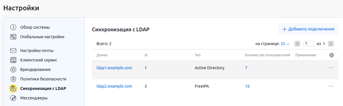 {ldap_id}— id существующего подключения к LDAP. Отображается в разделе Синхронизация с LDAP в колонке id.