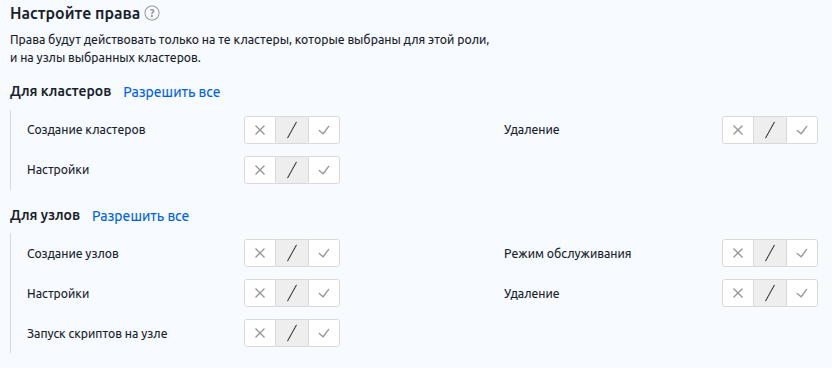 | Права могут быть выданы как для всех кластеров, так и для конкретных. Доступ к кластерам не подразумевает автоматического доступа к ВМ в этих кластерах. Он позволяет: