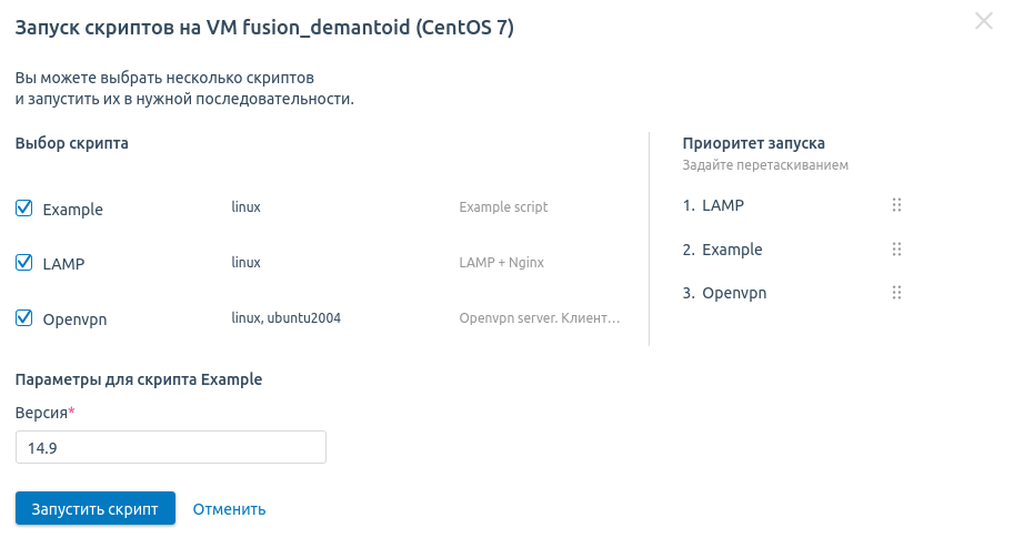 Чтобы запустить скрипты на ВМ, перейдите в Виртуальные машины → выберите ВМ → меню   →  Запустить скрипт → выберите скрипты → введите параметры скриптов → выберите порядок выполнения скриптов в колонке "Приоритет запуска" → Запустить скрипт.