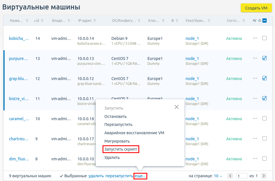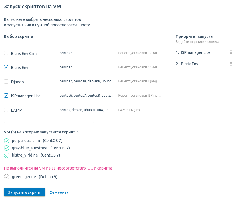 При выборе скриптов платформа выдаёт уведомление на каких ВМ скрипты могут быть запущены.