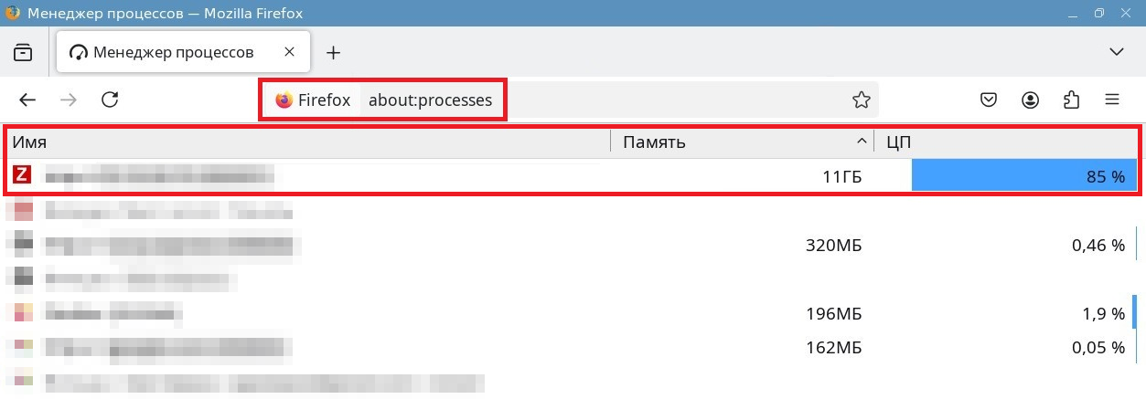 База знаний Software/ПО Браузеры Mozilla Firefox. Утилизация оперативной памяти Current: Активная веб-страница PDF Download PDF Download page Активная веб-страница. Current page All pages Активная веб-страница Статья является возможным решением инцидента Mozilla Firefox. Утилизация оперативной памяти ОкружениеAstra Linux Special Edition 1.8 Update 1uu2 (№2025-0114SE18MD) Диагностика В браузере:Перейти в Диспетчер задач, введя в адресной строке about:processes.Отсортировать список по используемой ОЗУ (столбец Память).Проверить, что существует процесс, использующий большое количество ОЗУ, например: Решение Ответ доступен с подключенной услугой «Техническая поддержка». Ознакомиться с услугой Перейти к авторизации Внимание! Для авторизации используйте учетные данные Личного кабинета Если учетная запись от новой версии личного кабинета отсутствует, просим писать на почту lk@astralinux.ru В браузере:Перейти в Диспетчер задач, введя в адресной строке about:processes.Отсортировать список по используемой ОЗУ (столбец Память).Проверить, что существует процесс, использующий большое количество ОЗУ, например: Возможная причина: Активная веб-страница. Перейти к решению. ×