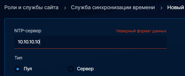 После обновления до версии ALD Pro 2.5.0 пропала возможность добавлять внешний NTP-сервер в виде IP-адреса в разделе Роли и службы сайта — Служба синхронизации времени — Внешний пул NTP-серверов. При вводе IP-адреса всплывает уведомление о неверном формате данных:
