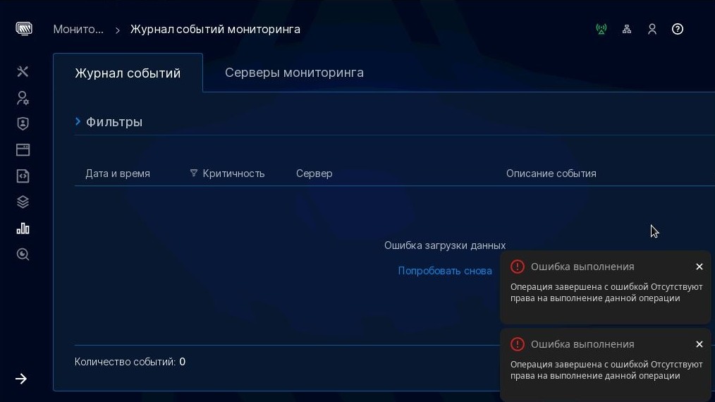 При переходе в Журнал событий мониторинга возникает ошибка.