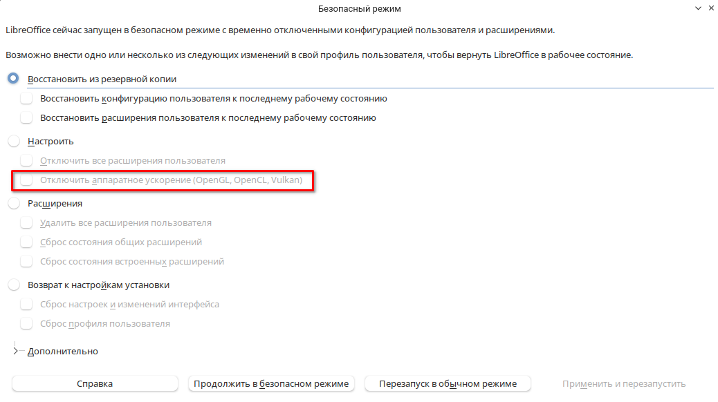 и проверить состояние настройки Отключить аппаратное ускорение (OpenGL, OpenCL, Vulkan):